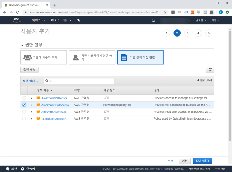 2. AmazonS3FullAccess 정책 연결