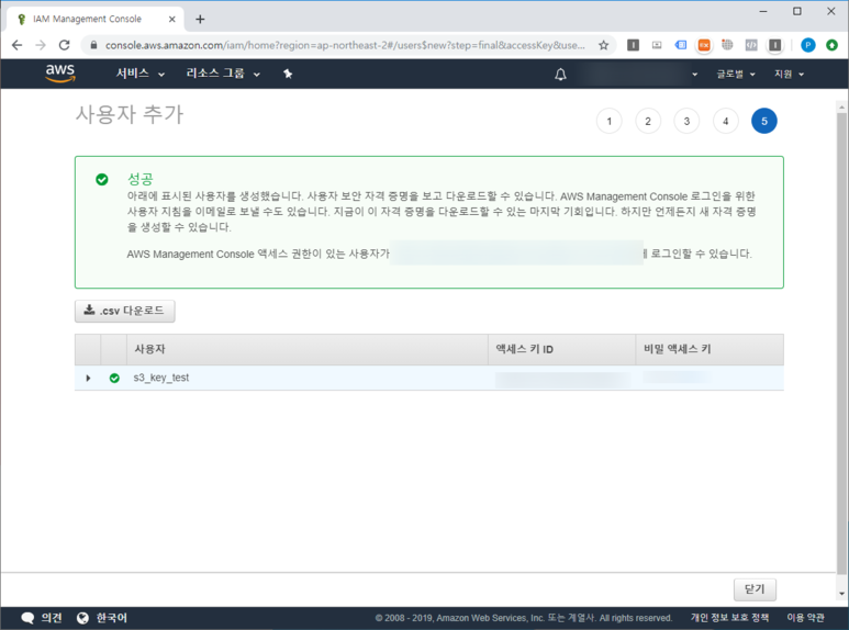 3. 사용자 생성 후, 나오는 키 저장